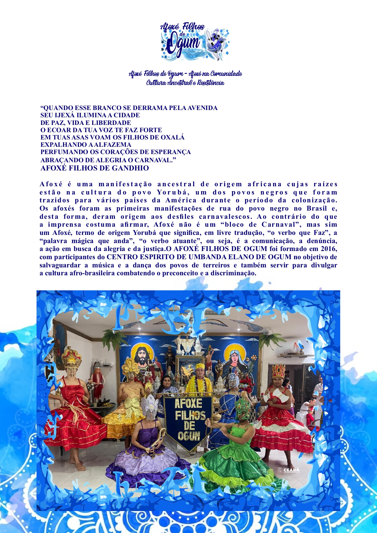 O AFOXÉ FILHOS DE OGUM foi formado em 2016, com participantes do CENTRO ESPIRITO DE UMBANDA ELANO DE OGUM no objetivo de salvaguardar a música e a dança dos povos de terreiros e também servir para divulgar a cultura afro-brasileira combatendo o preconceito e a discriminação. Atuante na salvaguarda e transmissão dos saberes nas Escolas e Instituições educacionais. PONTO DE CULTURA COORDENADORES HERCULES HENRIQUE SOUSA, NATANIEL ARAUJO E AUGUSTO MEDEIROS,