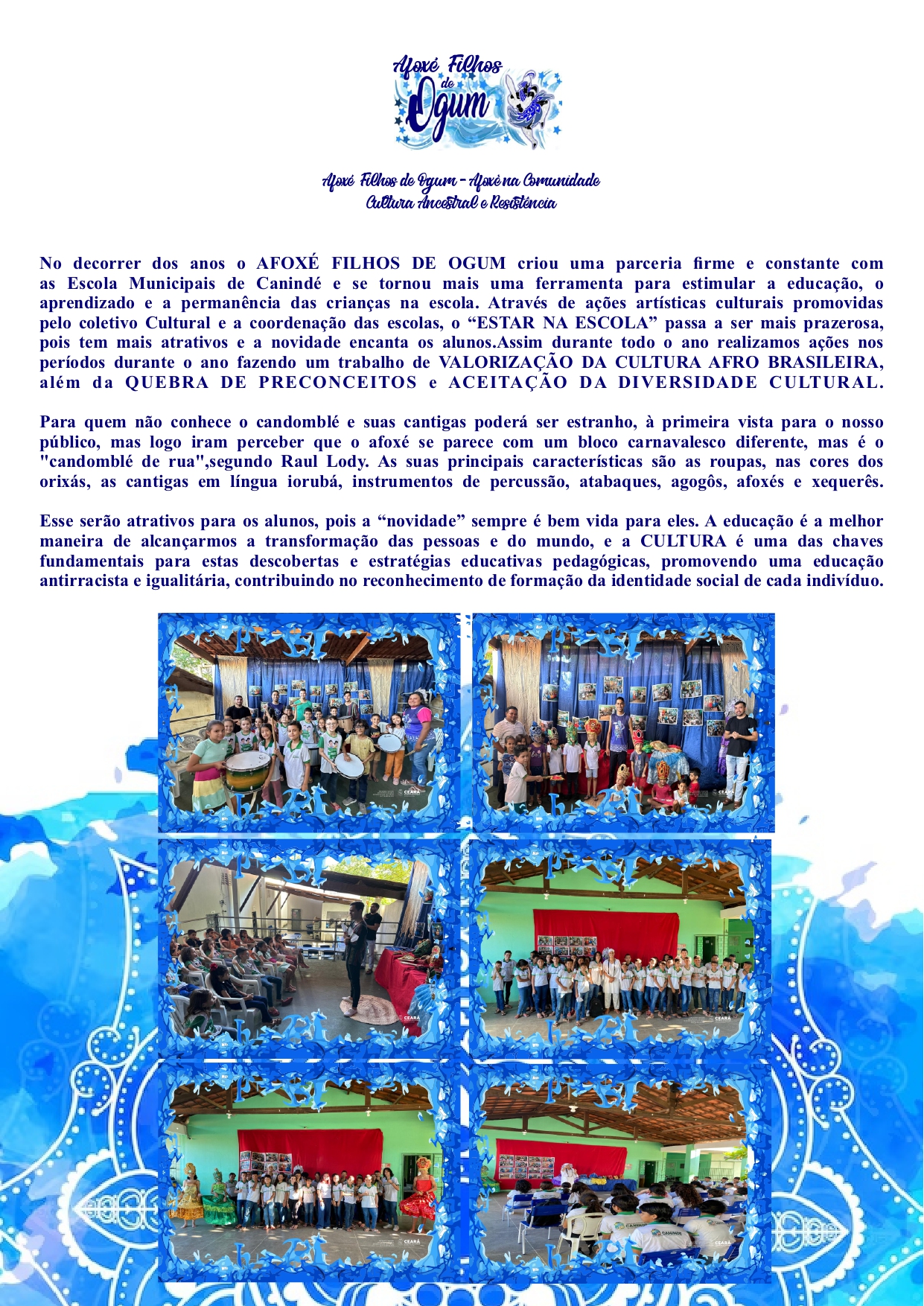 No decorrer dos anos o AFOXÉ FILHOS DE OGUM criou uma parceria firme e constante com as Escola Municipais de Canindé e se tornou mais uma ferramenta para estimular a educação, o aprendizado e a permanência das crianças na escola. Através de ações artísticas culturais promovidas pelo coletivo Cultural e a coordenação das escolas, o “ESTAR NA ESCOLA” passa a ser mais prazerosa, pois tem mais atrativos e a novidade encanta os alunos.