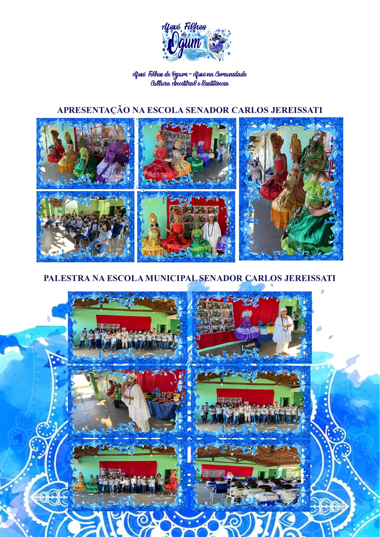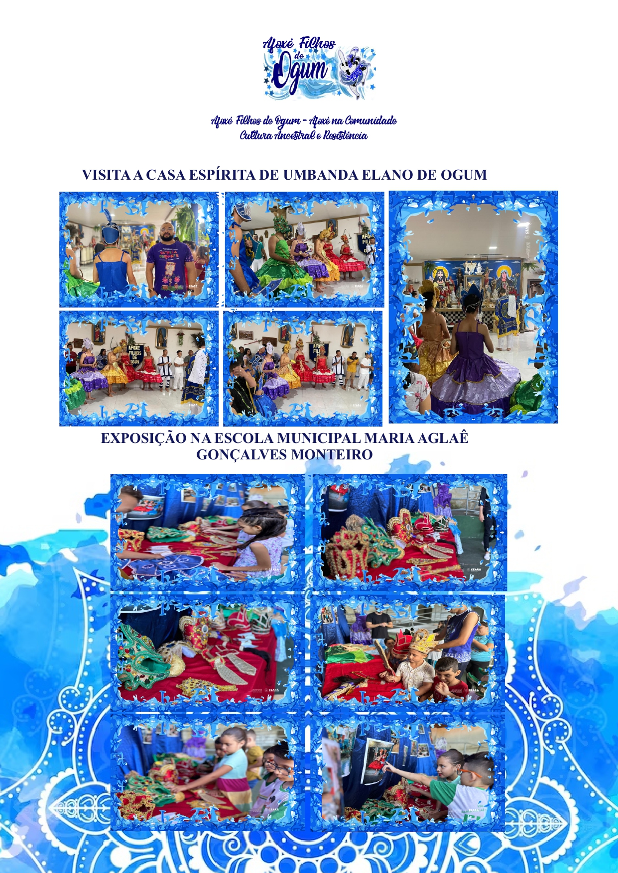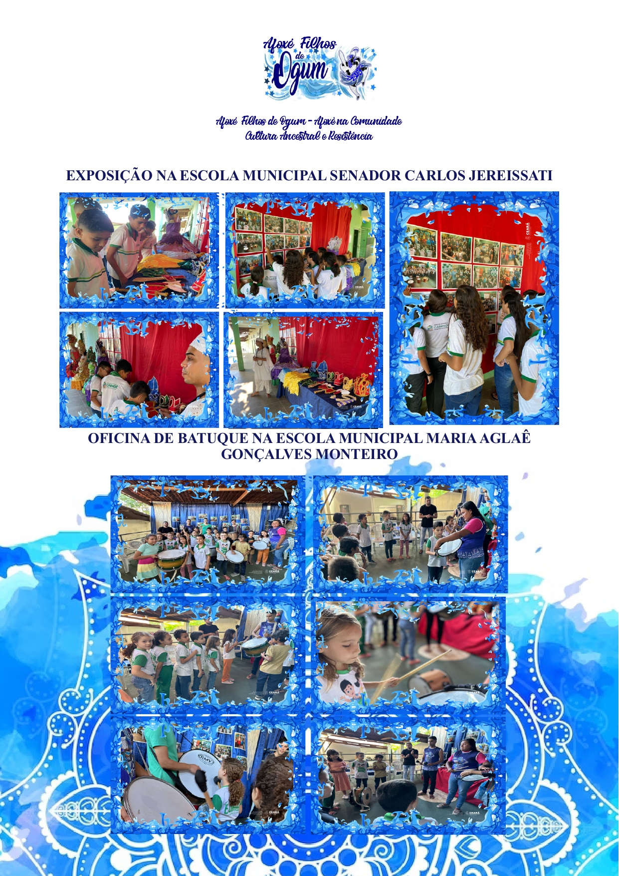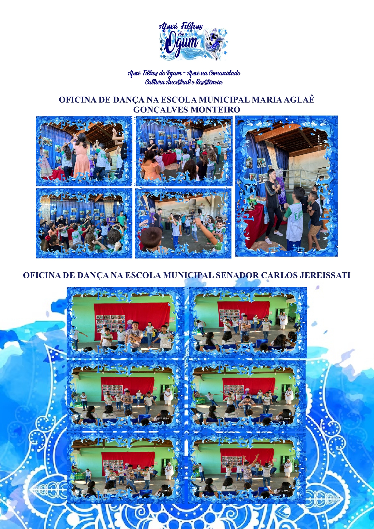 DURANTE O ANO REALIZAMOS JUNTO AS AESCOLAS MUNICIPAIS DE CANINDÉ OFICINAS DE DANÇA, OFICINAS DE BATUQUE, PALESTRAS E VISITAS GUIADAS AO CENTRO ESPIRITO DE UMBANDA ELANO DE OGUM.