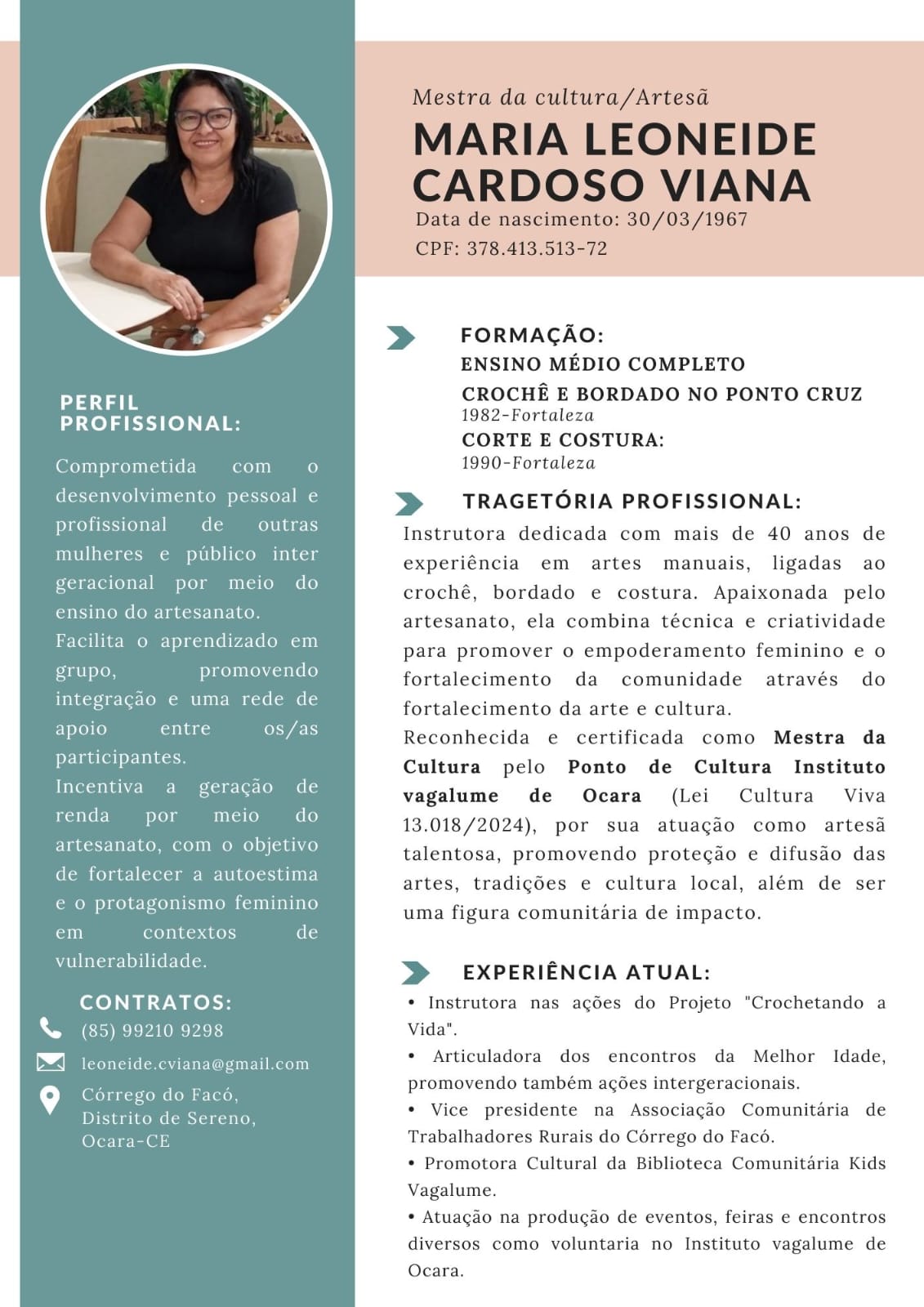 Artesã com mais de 40 anos de experiência em artes manuais, com foco em crochê, bordado em ponto cruz e costura. Apaixonada pelo artesanato, ela combina técnica e criatividade para promover o empoderamento feminino e o fortalecimento da comunidade através da arte. Atualmente é instrutora do projeto social "Crochetando a Vida", onde compartilha seus conhecimentos e incentiva outras mulheres a desenvolverem habilidades que possam transformar suas vidas.
