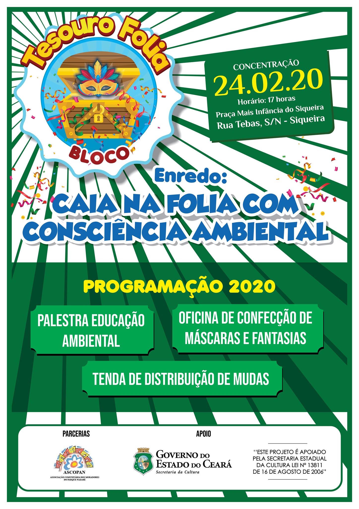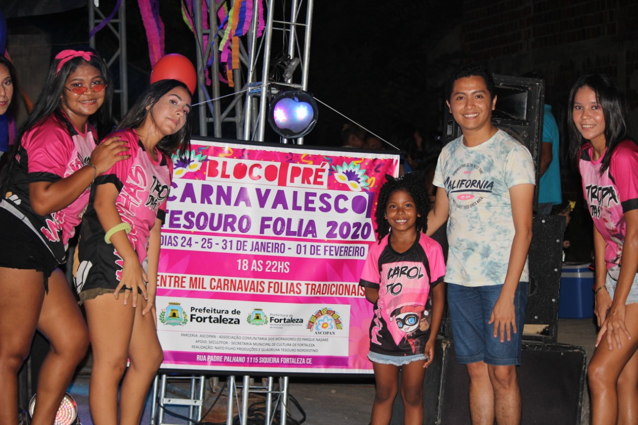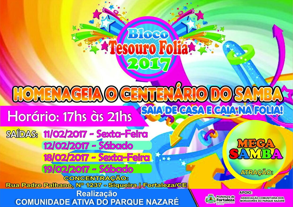 A AGREMIAÇÃO CARNAVALESCA BLOCO TESOURO FOLIA, NASCEU EM 2011, COM ATIVIDADE DE INTEGRAÇÃO DA COMUNIDADE DO PARQUE NAZARÉ NO BAIRRO SIQUEIRA 2, TENDO COMO SEU PRINCIPAL OBJETIVO CRIAR MEIOS DE APRECIAÇÃO E CONVIVIO SOCIAL PARA A POPULAÇÃO E BAIRROS VIZINHOS, TENDO CONHECIMENTO DAS PRATICAS E SABERES DAS DIVERSAS FOLIAS E FOLGUEDOS DO CARNAVAL CEARENSE, TENDO SEU PRIMEIRO DESFILE ACONTECIDO NA RUA GOMES SAMPAIO NO ANO DE 2011, AGREGANDO CERCA DE 100 BRINCANTES, DEVIDAMENTE FANTASIADOS COM O ENREDO FALANDO SOBRE A PAZ NO CARNAVAL, ATUALMENTE NOSSA AGREMIAÇÃO SI CONSOLIDA E A CADA ANO VAMOS CRIANDO NOVOS ENREDOS QUE VISAM ESTIMULAR A MENTE CRITICA DOS NOSSOS BRINCANTES E APRECIADORES, TORNADO A CULTURA CARNAVALESCA PRESENTE EM NOSSA HUMILDE PERIFERIA, DANDO ENTRETENIMENTO PARA O PUBLICO ADULTO, IDOSO, CRIANÇAS E ADOLESCENTES.