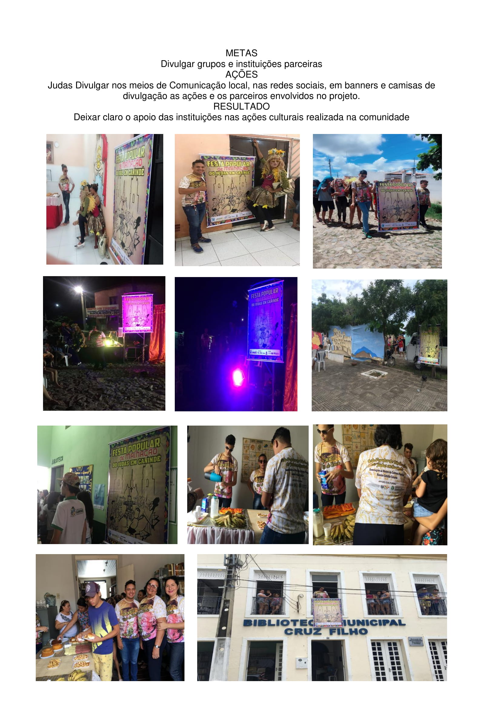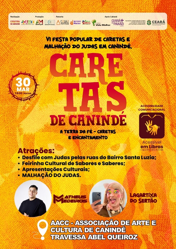 Em 2024 com mais apoio, realizamos com maestria a VI FESTA POPULAR DE CARETAS E MALHAÇÃO DO JUDAS EM CANINDÉ, A TERRA DA FÉ – CARETAS E ENCANTAMENTO, com varias ações na semana santa nos espaços públicos e culturais de Canindé e no Bairro Santa Luzia promovendo a preservação da memória coletiva CARETAS DE CANINDÉ, com acessibilidade, proporcionado aprendizado mútuo entre as novas gerações e mestras da cultura popular, com relevância nas questões da infância, diversidade artística e cultural, proporcionando também atividades que fortaleçam a inclusão social, geração de renda, circulação de bens e serviços na comunidade.