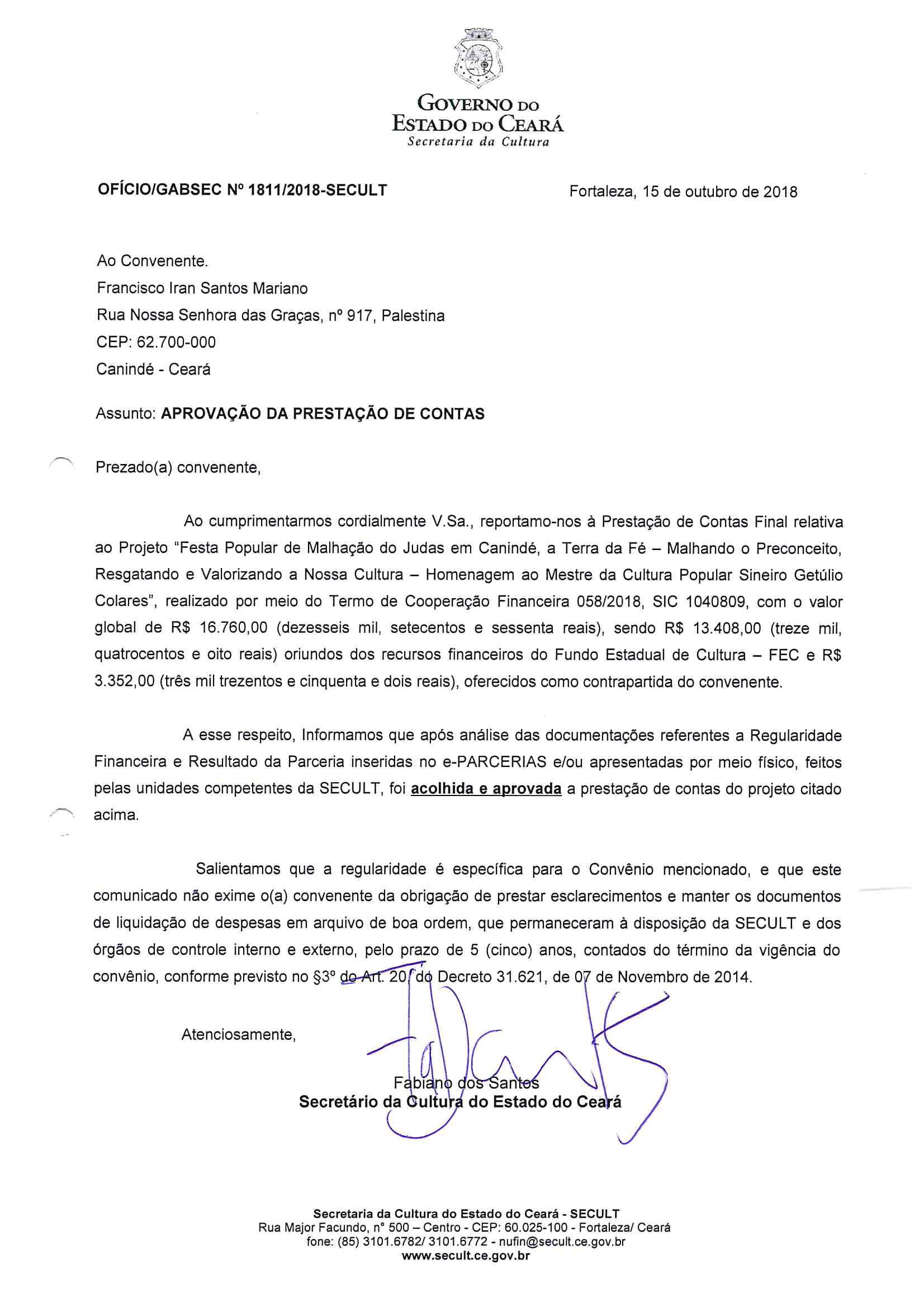 A FESTA POPULAR DE MALHAÇÃO DO JUDAS EM CANINDÉ, A TERRA DA FÉ - CARETAS E ENCANTAMENTO - Homenagem Mestra da Cultura de Canindé, é um festejo cultural cujo objeto principal é promover difusão e valorização das manifestações do período pascal do município de Canindé.