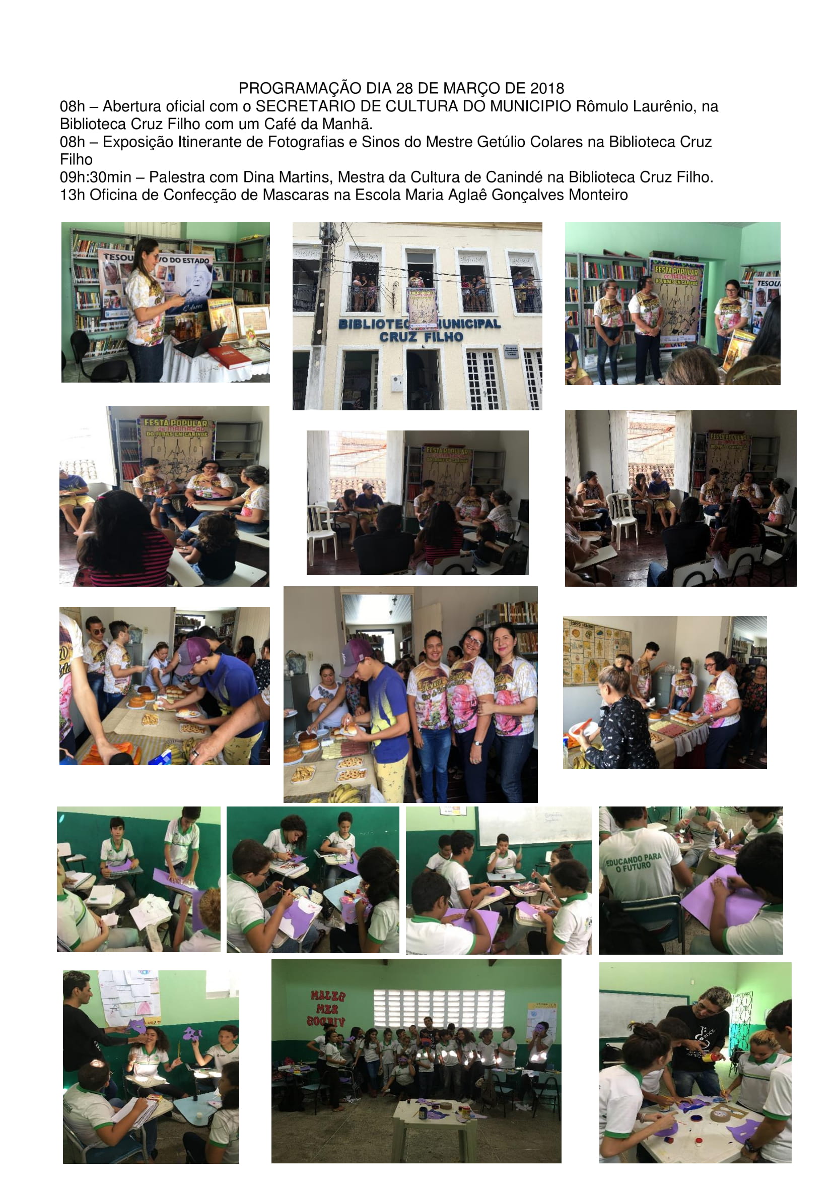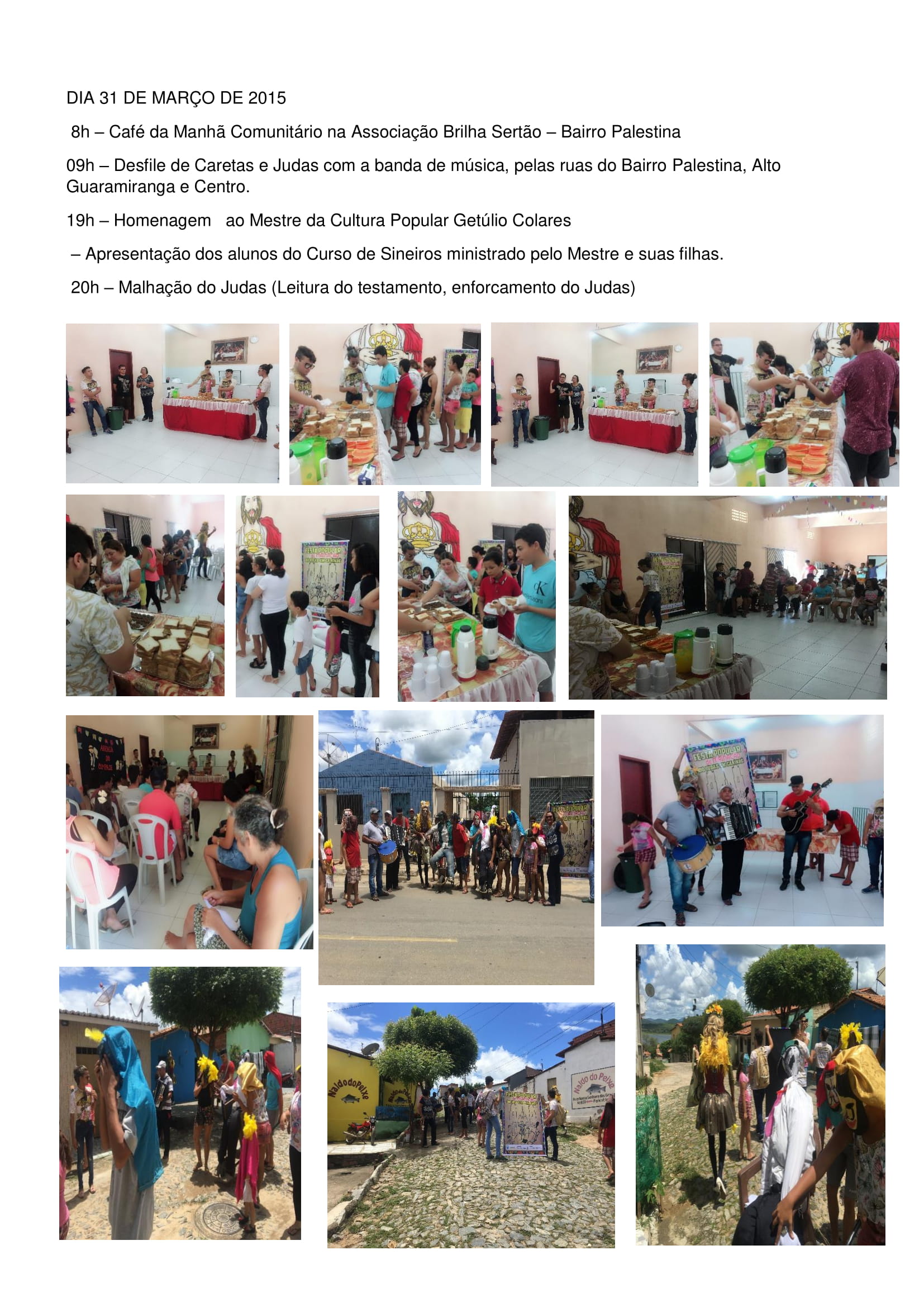 Na programação acontecerá Oficinas de Confecção de Máscaras e bonecos (Judas) Palestra sobre as Manifestações Culturais na Semana Santa, encenação de Paixão de Cristo, Desfile de Caretas pedindo esmolas pelas ruas, Leitura do Testamento e Malhação do Judas.