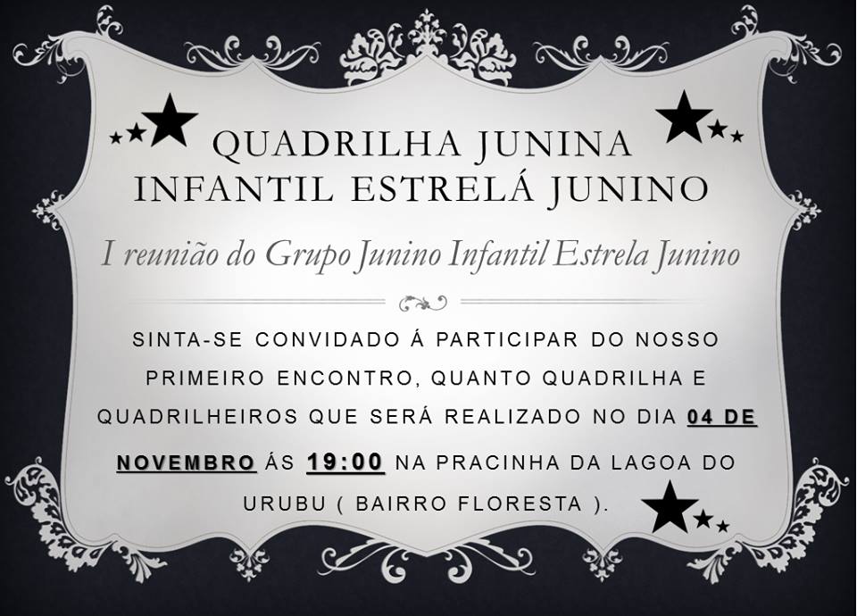 A QUADRILHA INFANTIL ESTRELÁ JUNINO É UMA AÇÃO CULTURAL DESENVOLVIDA PARA O PÚBLICO INFANTIL COM FAIXA ETÁRIA ENTRE O5 A 12 ANOS, NO BAIRRO PERIFÉRICO DA CAPITAL, FUNDADO EM 25 DE MARÇO DE 2016, DESPERTANDO NOS ENVOLVIDOS O DESEJO DE SI PARTICIPAR DOS TRABALHOS JUNINOS NO ESTADO DO CEARÁ.OS ENSAIOS ACONTECEM A PARTIR DO MÊS DE FEVEREIRO E ESTENDE-SE A MAIO, O GRUPO PARTICIPA DE FESTIVAIS JUNINOS E APRESENTAÇÕES POR TODA CIDADE E REGIÃO METROPOLITANA.VENHA NOS CONHECER!