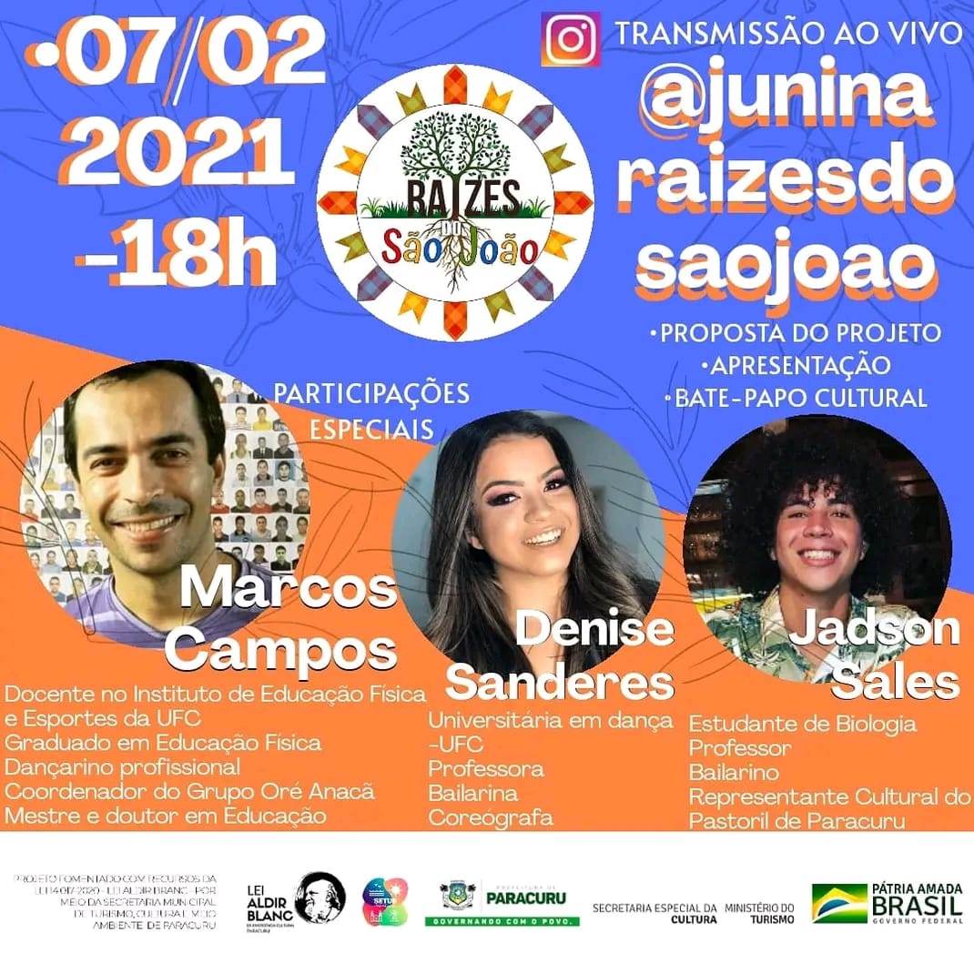 JOSE JADSON SALES DE OLIVEIRA é Graduado em ciências Biológicas pelo IFCE - campus Paracuru, Técnico em meio ambiente - CENTEC SGA, Pós-graduado em gestão escolar, ensino de ciências e ensino de libras - Faceminas 2024 é membro do Pastoril mariinha da ló desde 2004, até os dias atuais, e nesse grupo ja participou de vivências e eventos importantes a exemplos das amostras estaduais de natal, encontro de Mestres do mundo, Teatro josé de alencar, 2 edição do festival Vida & Arte, encontros SESC POVOS DO MAR, Amostras municipais do ciclo natalino e aparições em documentários e vídeos de alusão cultural, faz parte do Movimento Junino desde 2012 - 2025, tramitando nos grupos culturais: ARRAIA NOVA ESPERANÇA 2012 A 2014 e no grupo junino FORÇA JUNINA, atuando como bailarino, coreografo e marcador de 2015 - 2026, foi integrante do Grupo de teatro - oficina de expressão 2014 - 2016 na escola de ensino medio Maria Luiza Saboia, fazendo parte de eventos importantes no cento de humanidades da UECE e em diversas escolas, e ainda foi aluno da escola de dança de paracuru - 2017 - 2022, participando de bienais de danças, espetaculos internos e as amostras de danças do litoral oeste, o agente cultural, ocupa a cadeira no Conselho municipal de políticas culturais - LGBTQIA+ - 2019 - 2024 e dentro dessa cultura é fundador do coletivo ”DIVALTA” grupo de altinha com as temáticas e bandeiras da diversidade de gênero, com esse projeto ja foi possivel realizar diversas ações no ramo do esporte, divesidade de genero, educação ambiental, inlcusão e pricipalemte da cultural LGBTQIA. O agente de cultura atua em sala de aula como professor de ciências e junto às escolas desenvolveu diversos projetos de cunho social, ambiental, literário, esportivo e de inclusão social.Vídeos