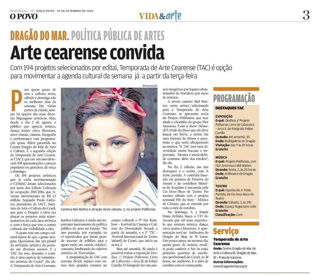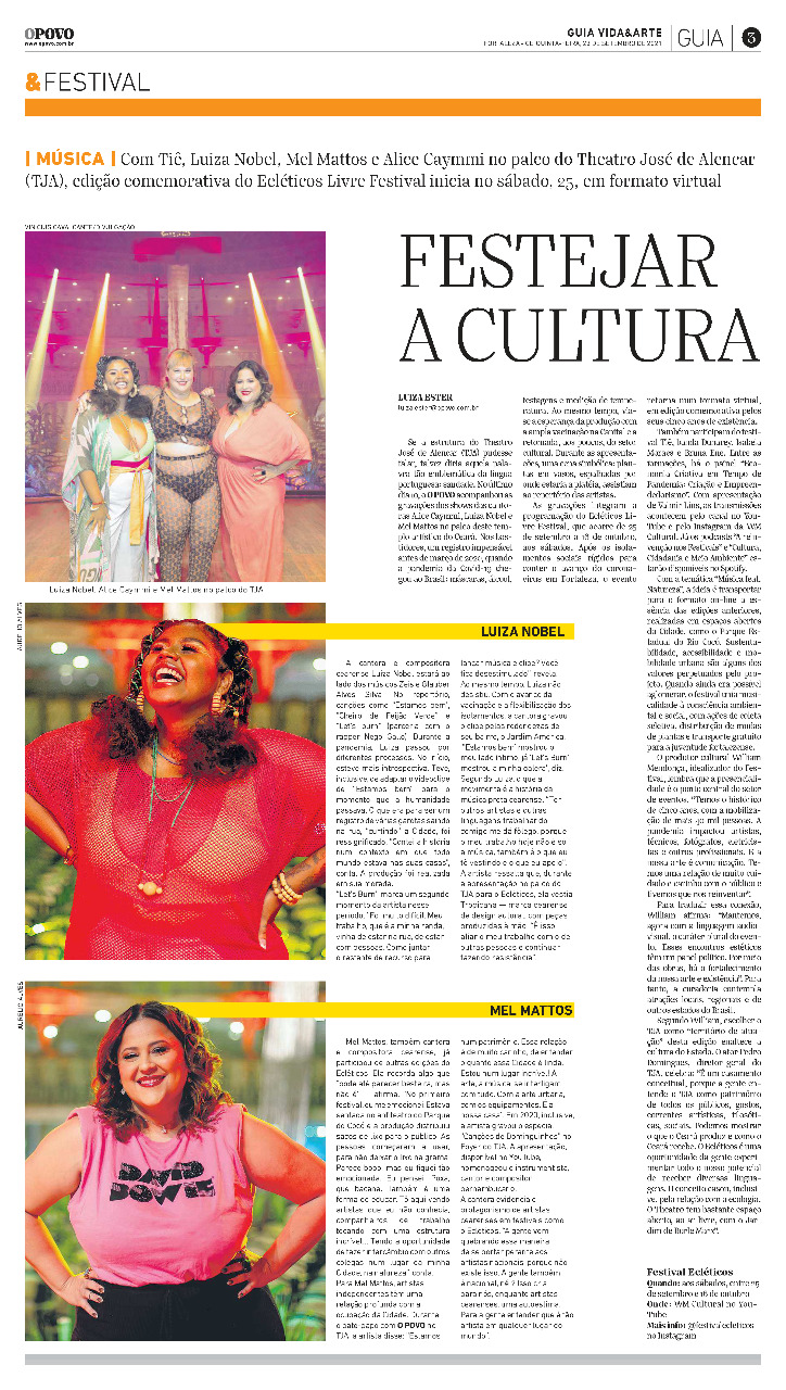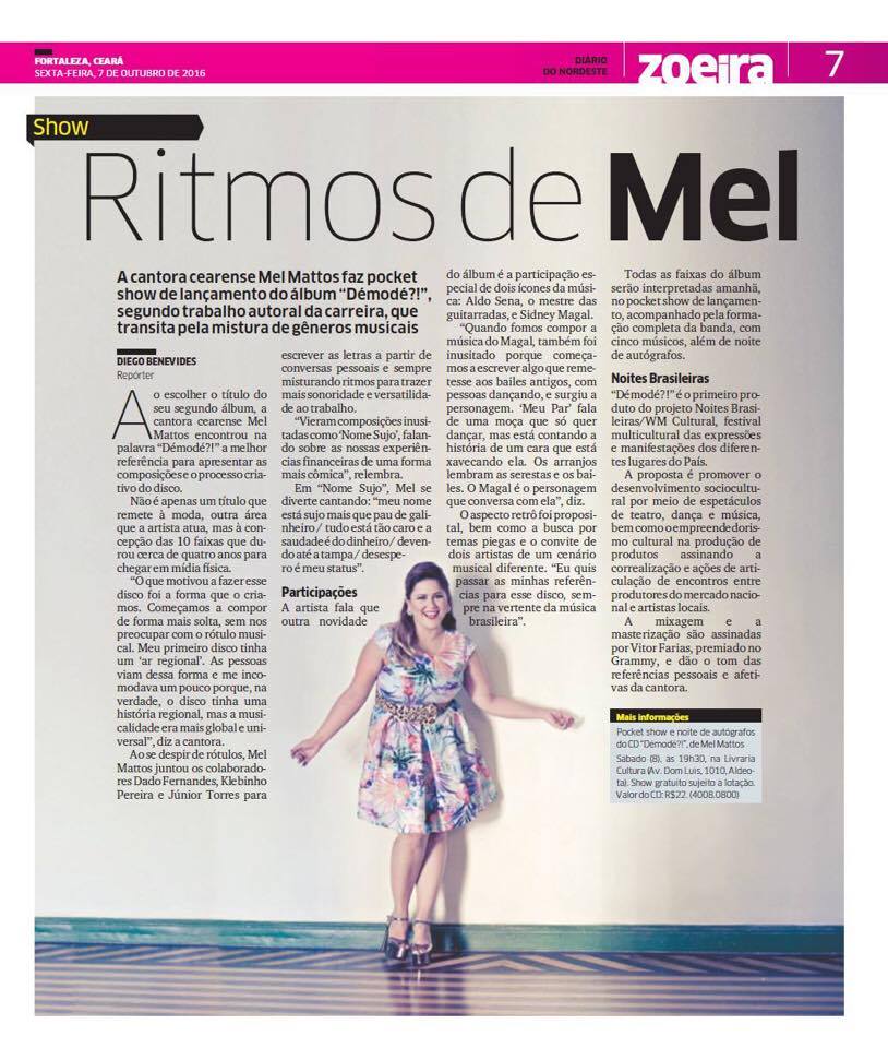 Cantora, compositora, empreendedora, designer de moda e um turbilhão de emoções. Essa é a talentosa Mel Mattos, uma cearense que defende a pluralidade da Música Brasileira, distante de rótulos. São dez anos de carreira autoral, e vinte anos desde que estreou nas bandas de baile, passando por bares, a programa de reality show, conseguindo destaque nacional como finalista do Grupo Rouge.