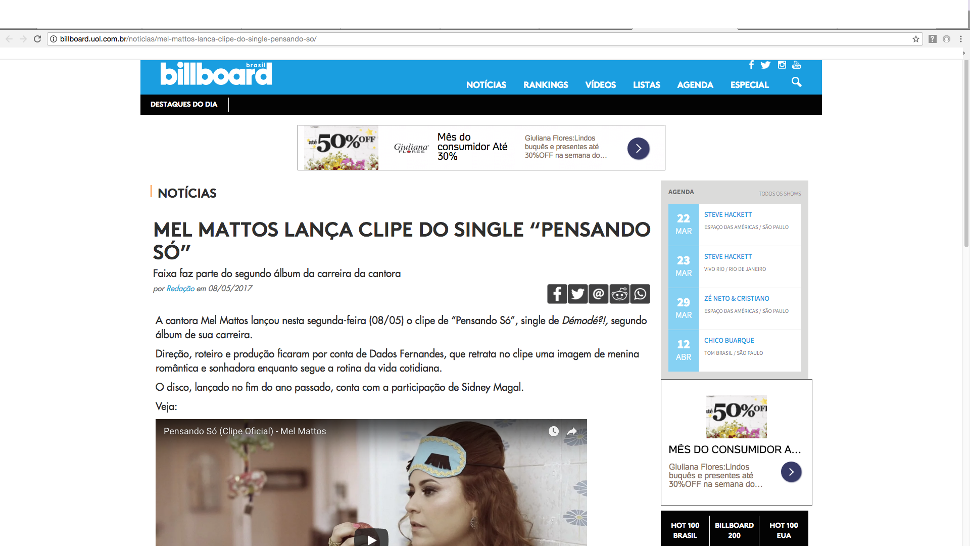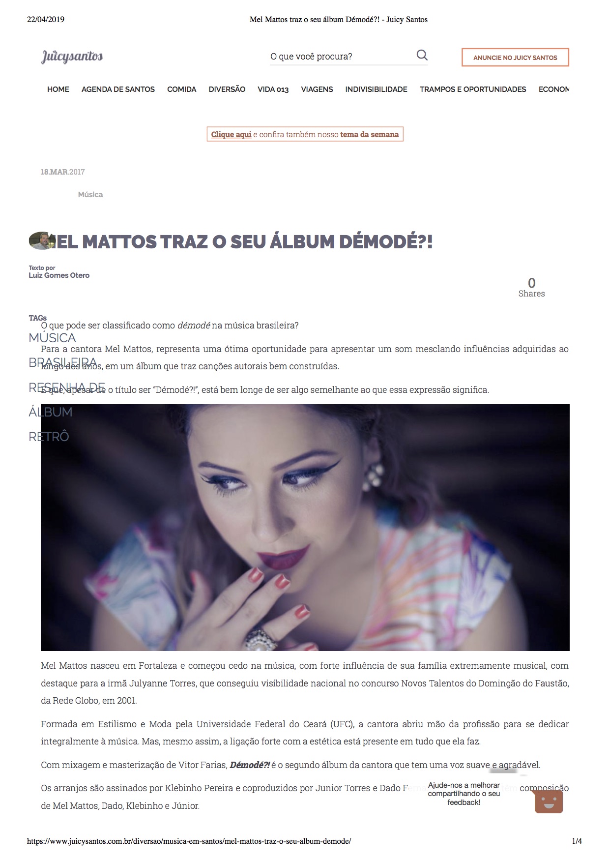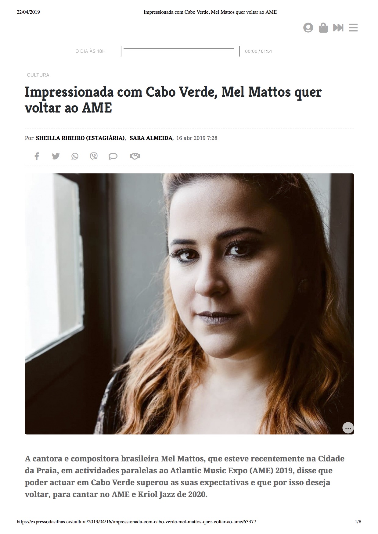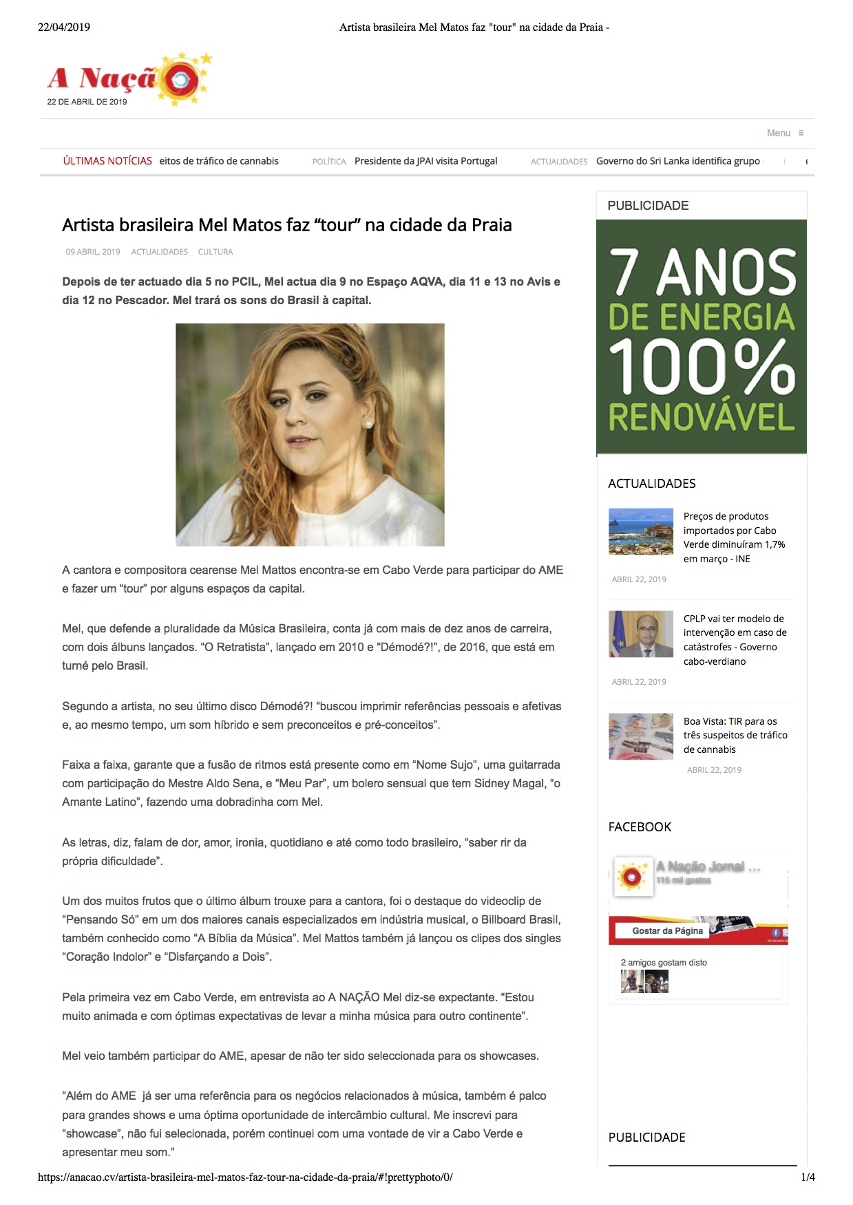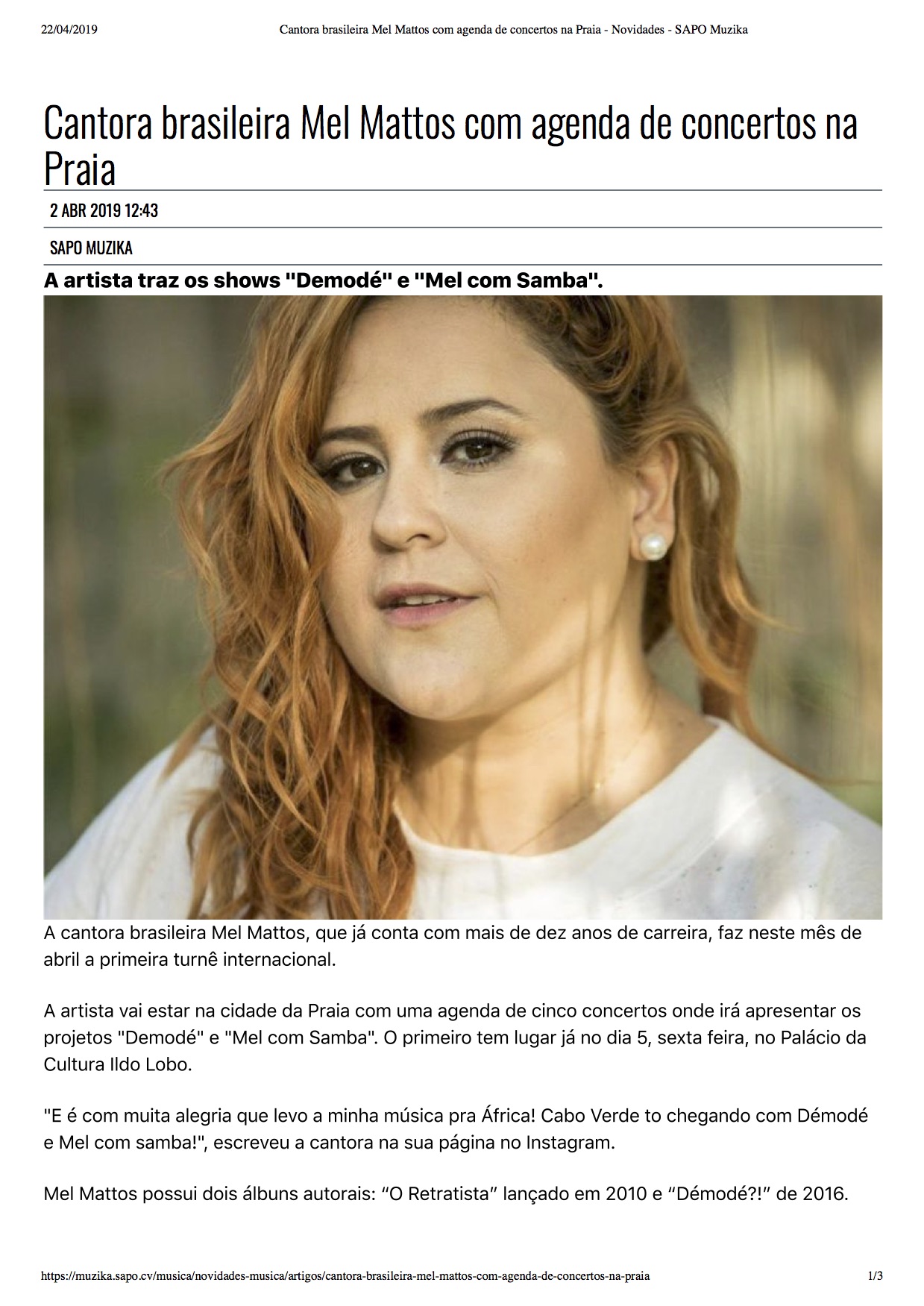 Em abril de 2019 Mel Mattos fez uma turnê em Cabo Verde (África), onde foi oitavo lugar em destaque nas principais notícias do país.