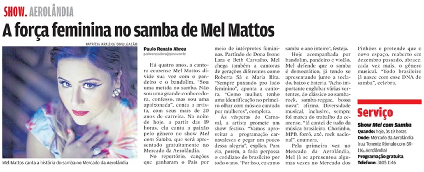 Em Fevereiro/Março (2019) Mel Mattos participou da programação oficial do Ciclo Carnavalesco de Fortaleza, se apresentado no MErcado da Aerolândia no Pré- Carnaval e no Carnaval no palco do Aterro, visto como o principal palco do Ciclo.