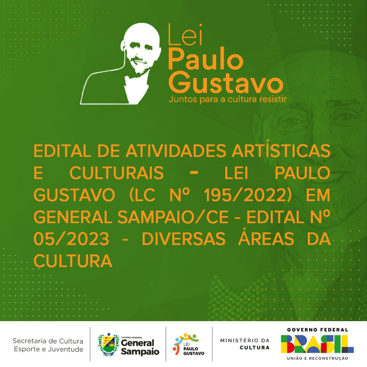 O Município de GENERAL SAMPAIO, por meio da Secretaria de Cultura, Esporte e Juventude, inscrito no CNPJ sob o nº 07.438.591/0001-22, com fundamento nas disposições da Lei Complementar nº 195, de 08 de julho 2022 - intitulada Lei Paulo Gustavo; Decreto Federal n.º 11.453, de 23 de março de 2023 e Decreto Federal nª 11.525 de 11 de maio de 2023; e, no que couber, nas demais legislações aplicáveis à matéria, torna público o presente EDITAL para Seleção de Propostas de Atividades Artísticas e Culturais.