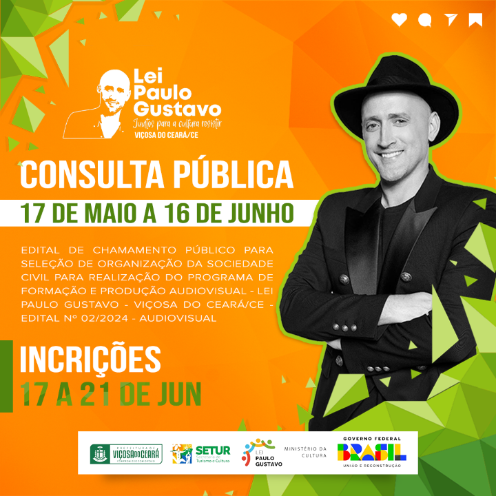 EDITAL DE CHAMAMENTO PÚBLICO PARA SELEÇÃO DE ORGANIZAÇÃO DA SOCIEDADE CIVIL PARA REALIZAÇÃO DO PROGRAMA DE FORMAÇÃO E PRODUÇÃO AUDIOVISUAL - LEI PAULO GUSTAVO - VIÇOSA DO CEARÁ/CE - EDITAL Nº 02/2024 - AUDIOVISUAL