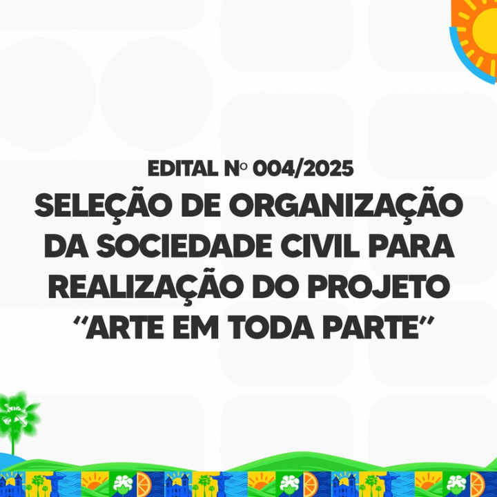 O objeto deste Edital é a seleção de 1 (uma) organização da sociedade civil para REALIZAR O PROJETO “ARTE EM TODA PARTE” POR MEIO DO USO DE RECURSOS DA POLÍTICA NACIONAL ALDIR BLANC DE FOMENTO À CULTURA (PNABII) - RUSSAS/CE, em regime de parceria com a Secretaria de Cultura, Turismo e Esporte de Russas, conforme Termo de Referência para a Colaboração (Anexo I).